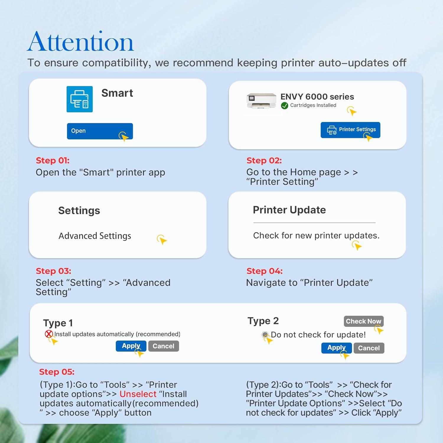 Printer Compatibility: (4)Deskjet 4100 4100e Series: 4110e, 4120e, 4121e, 4122e, 4123e, 4130e, 4132e, 4133e, 4152e, 4155e, 4158e; DeskJet Plus 4122, 4132, 4155 (5)ENVY 6000 Series: 6010e, 6020e, 6022e, 6030e, 6032e, 6034e, 6050e, 6052e, 6055, 6055e, 6065e, 6075, 6075e (6)ENVY 6400 Series: 6420e, 6422e, 6430e, 6432e, 6450e, 6452e, 6455e, 6458e, 6475e; ENVY Pro 6455, 6458, 6475